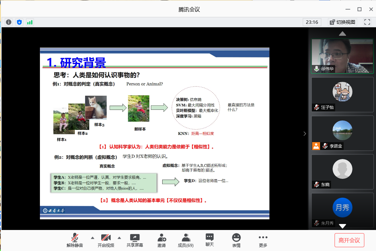 应公司邀请,6月27日上午,西南大学徐伟华教授在腾讯会议作了《概念认知学习的粒计算机理及其最新研究进展》的报告。相关师生聆听了此次报告,报告由李进金教授主持。