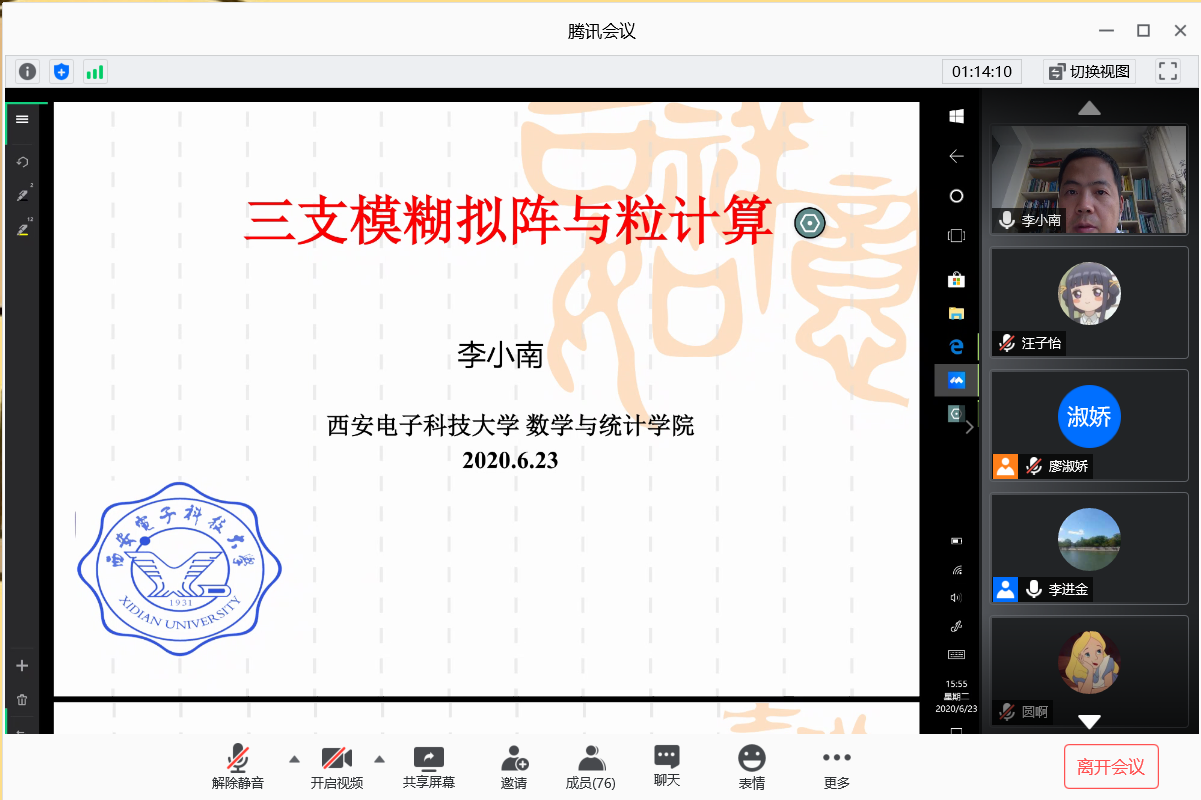 应公司邀请,6月23日下午,西安电子科技大学李小南副教授在腾讯会议作了《三支模糊拟阵与粒计算》的报告。相关师生聆听了此次报告,报告由廖淑娇副教授主持。