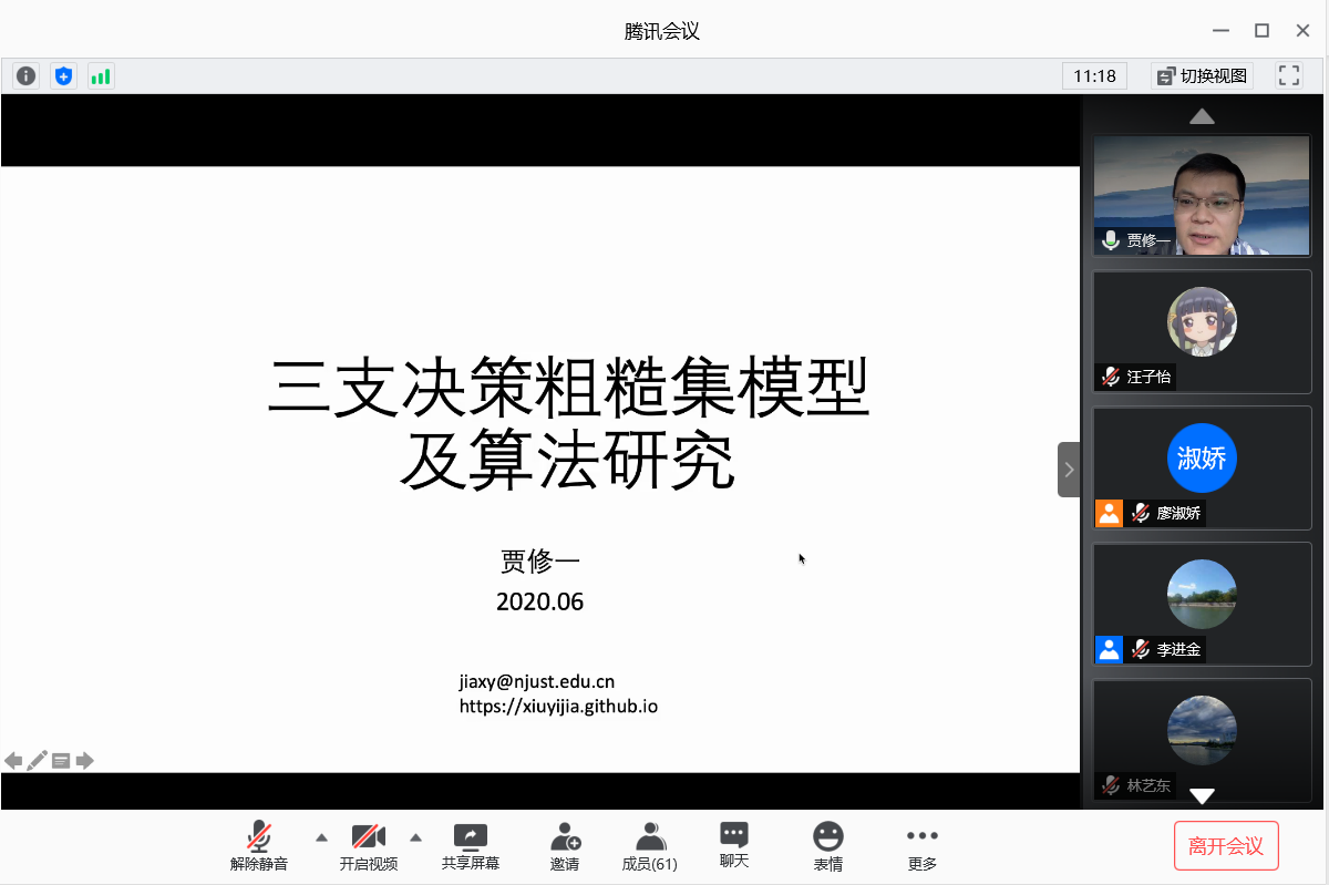 应公司邀请,6月20日上午,南京理工大学贾修一教授在腾讯会议作了《三支决策粗糙集模型和算法研究》的报告。相关师生聆听了此次报告,报告由廖淑娇副教授主持。