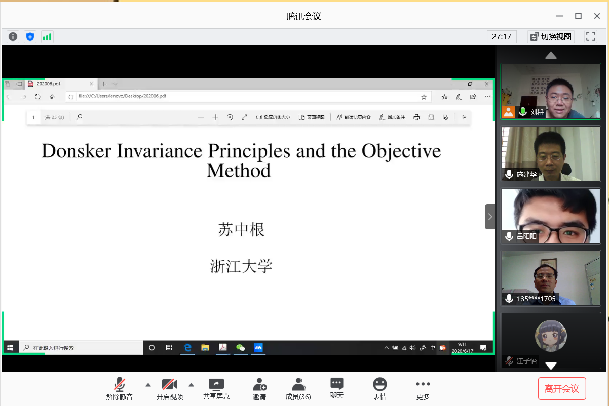应公司邀请,6月17日上午,浙江大学苏中根教授在腾讯会议作了《On the Donsker Invariance Principles and the Objective Methods》的报告。相关师生聆听了此次报告,报告由刘群副教授主持。