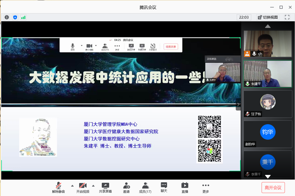 应公司邀请,6月11日下午,厦门大学朱建平教授在腾讯会议作了《大数据发展中统计应用的一些思考》的报告。相关师生聆听了此次报告,报告由施建华老师主持。