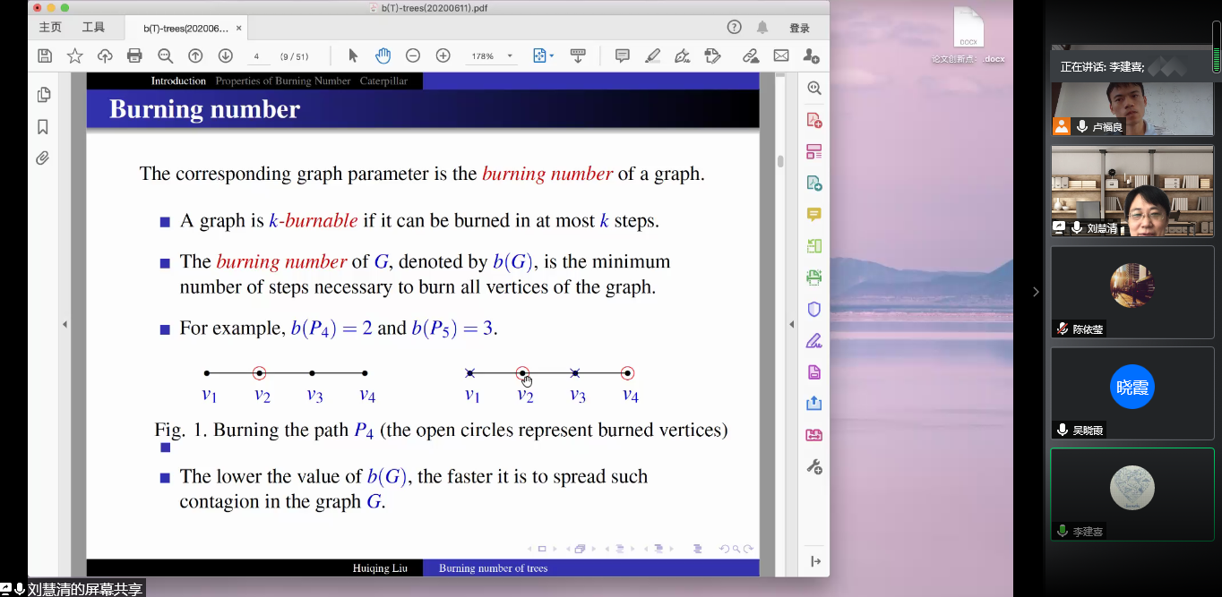 应公司邀请,6月11日上午,湖北大学刘慧清教授在腾讯会议作了题为《On the burning number of trees》的报告。相关师生聆听了此次报告,报告由卢福良教授主持。