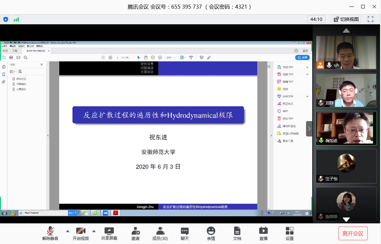 应公司邀请,6月3日上午,安徽师范大学祝东进教授在腾讯会议作了《一类反应扩散过程的遍历性和Hydrodynamical limit》的报告。相关师生聆听了此次报告,报告由施建华副教授主持。
