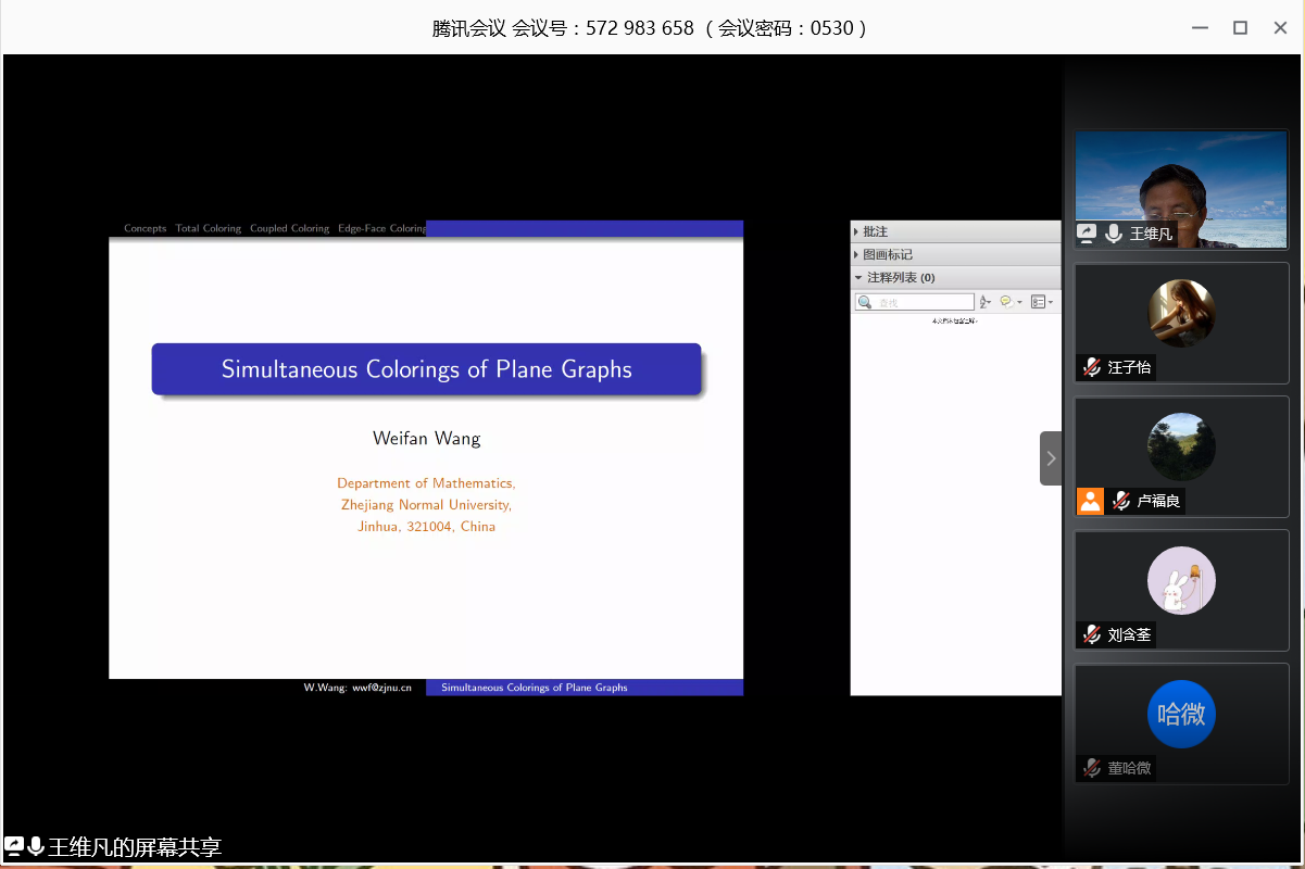 应公司邀请,5月30日上午,浙江师范大学王维凡教授在腾讯会议作了《Simultaneous Colorings of Plane Graphs》的报告。相关师生聆听了此次报告,报告由卢福良教授主持。