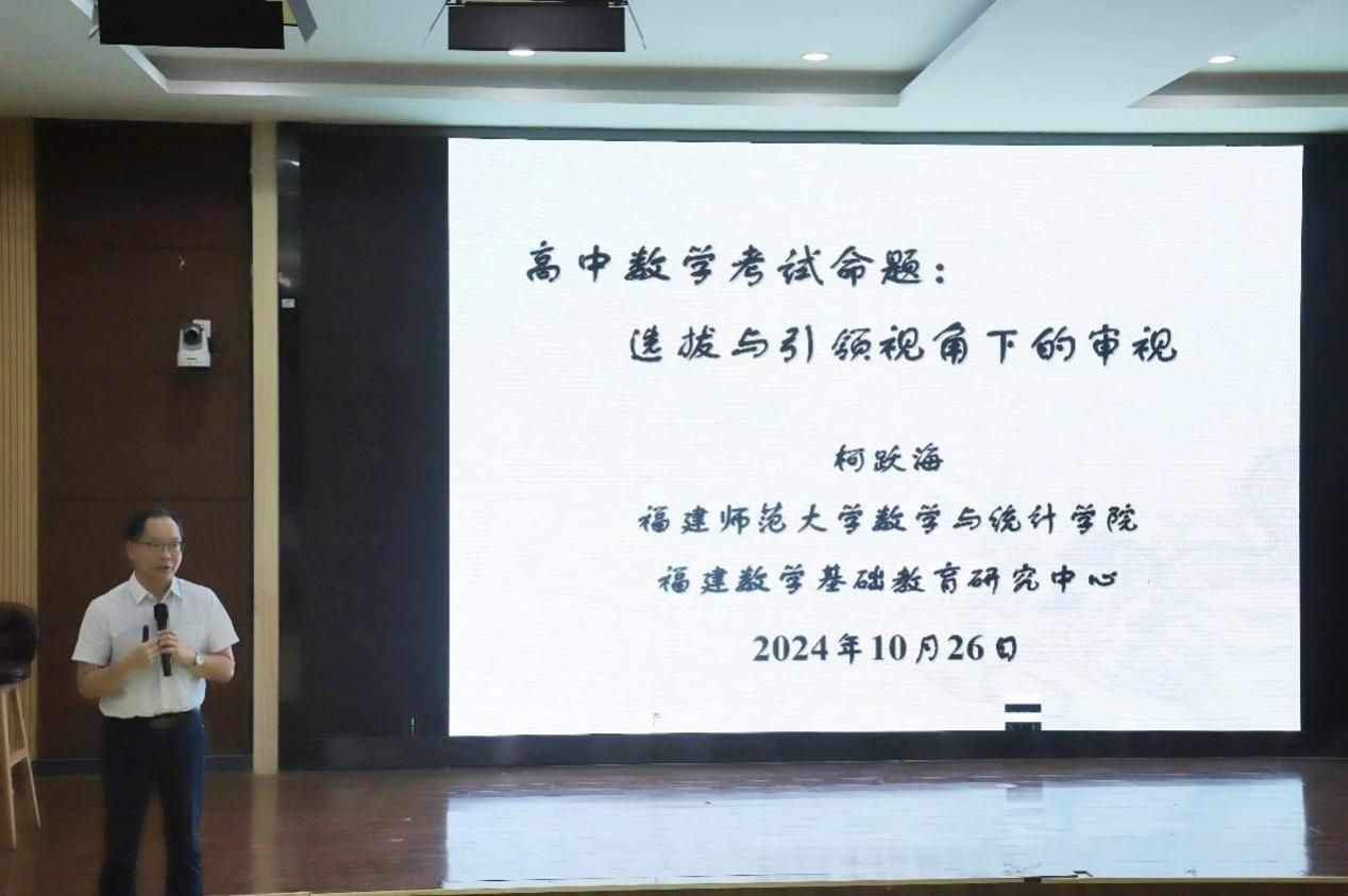 福建师范大学柯跃海教授作题为《高中数学考试:选拔视角下的命题于评价》的讲座。柯跃海教授从高考数学考试命题是否遵循命题依据、是否有效引导教学、是否科学合理准确以及是否合乎命题规范四个视角来阐述高考数学试题选拔视角下的命题与评价,并列举了许多例题进行讲解,让一线教师和员工们受益匪浅。