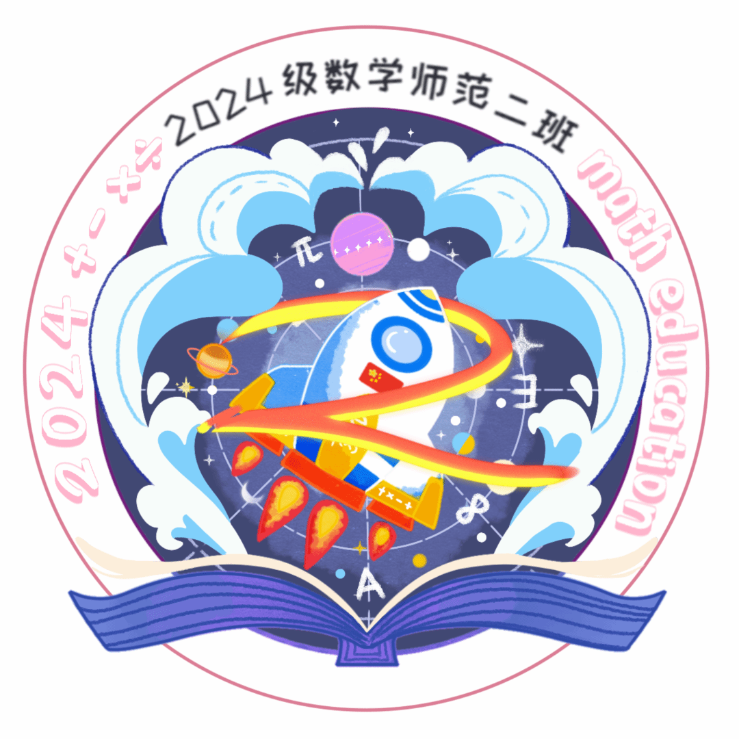 班徽中心的火箭形象,寓意着班级成员对知识的无尽追求和探索精神。在它周围环绕的数字与行星,与背景的星辰大海,则寓意着数学知识的广阔天地和无限可能。右方的“Math Education”和浪花与画面中心数字“2”字样,表明专业特色和数本二班,让每一位班级成员都能感受到自己属于这个团结、有爱的集体,并体现了大家乘风破浪的精神。