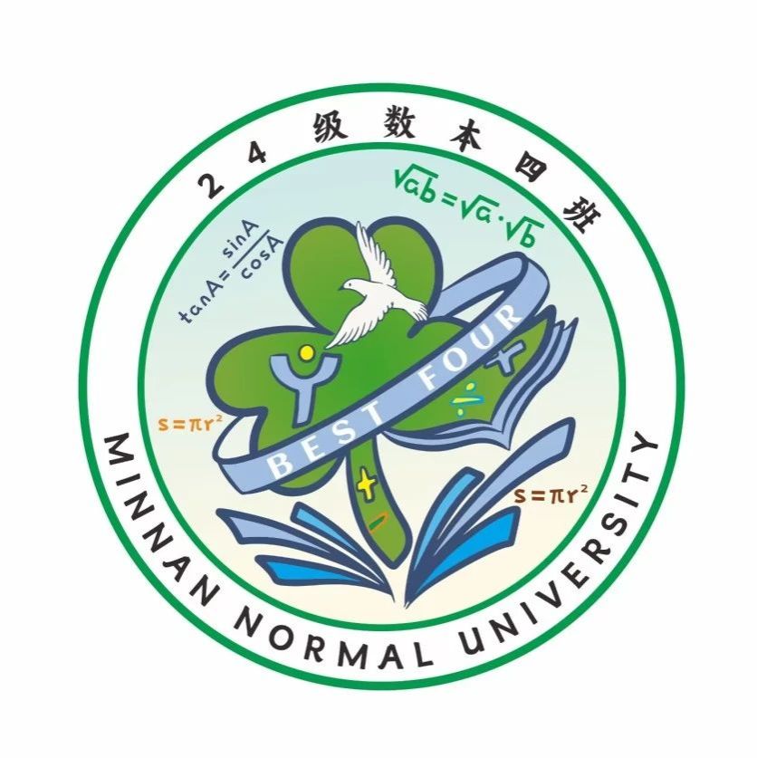 班徽以三叶草为主体,代表了幸运与真诚,和下方的书一起,代表了我们在学习过程中茁壮成长。三叶草根部的“+,-”符号象征着数学的基础,而三叶草的一片“书页”和乘除号代表我们知识的扩展。三叶草内X绘以和平鸽形象,Y绘以人的形象,意蕴着我们数师四班的同学和平相处,周围用我们现学的数学公式点缀。“BEST FOUR”的彩带,则象征着我们四班最棒。