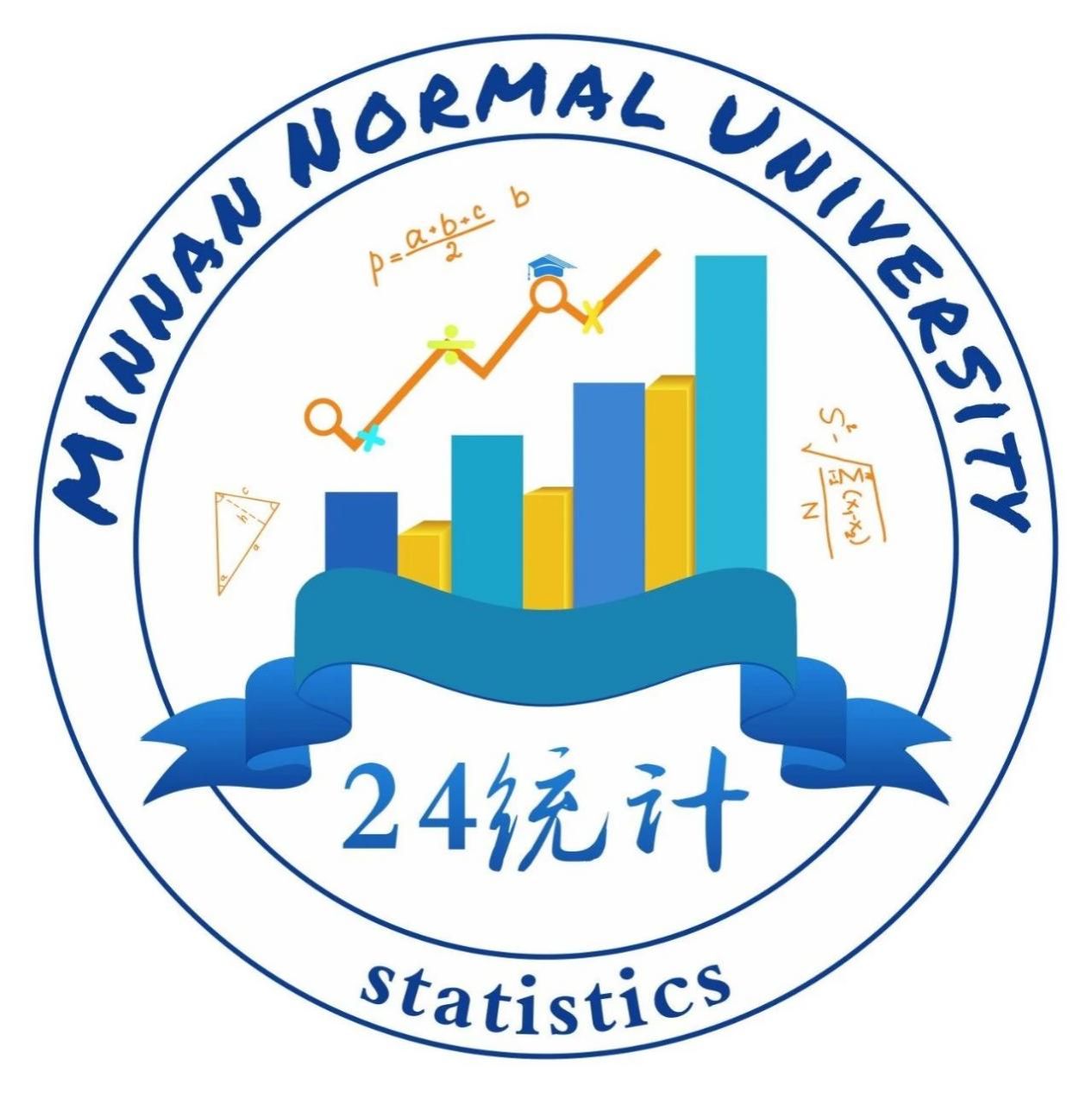 班徽以统计的标志图像——条形图和折线图为主体。折线图呈现上升的趋势,是统计班学子坚信“道路是曲折的,前途是光明的”的外在体现。寓意着高水平的蓝丝带,则是我们对卓越自我的追求。条形图、折线图与蓝丝带构成的山海之姿,展现出我们“海到无涯天作岸,山登绝顶我为峰”的壮志豪情。背景中的数学公式与符号,意味着我们将凭借坚实的数学基础,立足数学根本,迈向专业高峰。