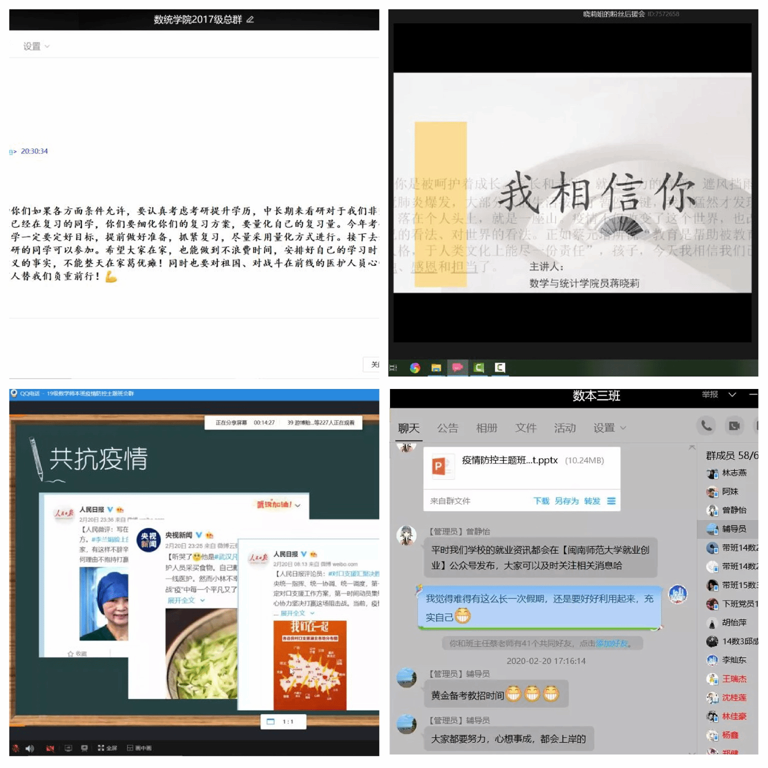 2017级辅导员郭彬彬围绕“疫情防控攻略”、“争做疫情四大员”、“疫情期间考研规划”、“疫情期间实习安排”等主题,给342名同学上了一堂“决胜疫情、从我做起”线上班会课”。郭老师希望同学们以积极的态度面对疫情,同时鼓励同学们参加研究生招考,建议待实习员工充分利用这段时间。