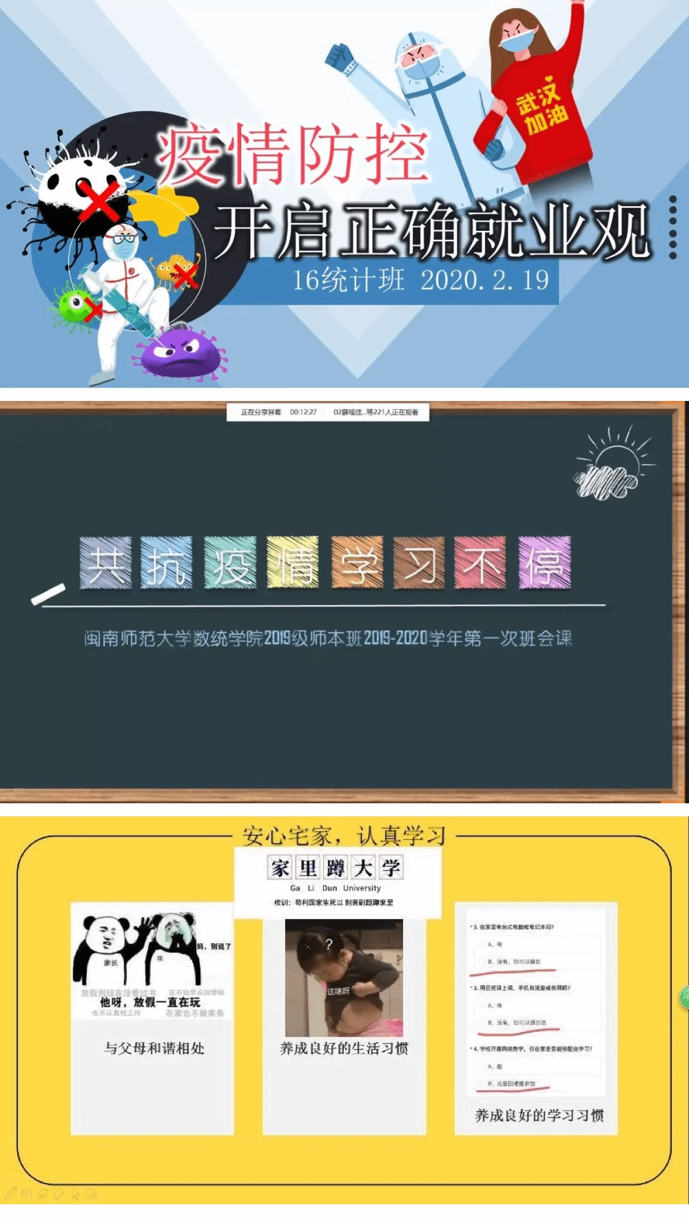 2019级辅导员许晴与张赫分别以“共抗疫情,学习不停”和“齐心抗疫情,宅家学习”为主题为2019级的同学们开展班会课。两位老师均组织同学们了解抗击心冠肺炎的有关情况,倡议同学们同心抗疫,并敦促同学们在疫情期间自觉学习。此外,许老师建议同学们如若出现心理不适情况,可以向公司老师或校心理咨询中心咨询。