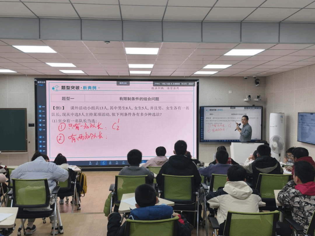 1月11日下午,第二场课堂是由郑志景老师主讲的“趣味组合选讲”,在郑老师的精彩课堂上,学员们深入学习了组合的综合应用、分类加法与分步乘法等知识点。老师巧妙结合等差数列导出公式等知识,让学员们在应用这些公式的同时知晓其产生的原理,激发学习热情。