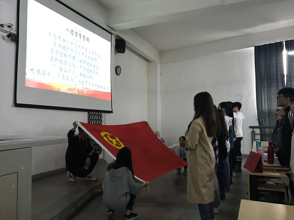 活动开场由陈明老师发表动员讲话,陈明老师对七位新团员的到来表示欢迎,要求他们努力学习、崇尚科学、追求真知,为团旗增辉、为团旗添色、为早日成为国家栋梁之材而发奋图强。随后,陈明老师宣读了新团员名单,全场人员一同起立,举行入团宣誓仪式,一声声铿锵有力的誓言令现场气氛更加肃穆庄重。