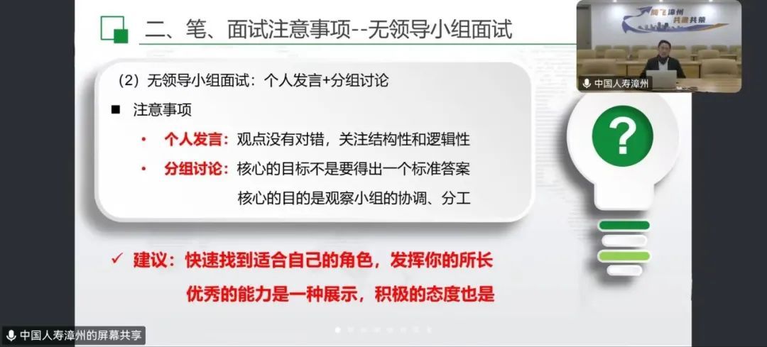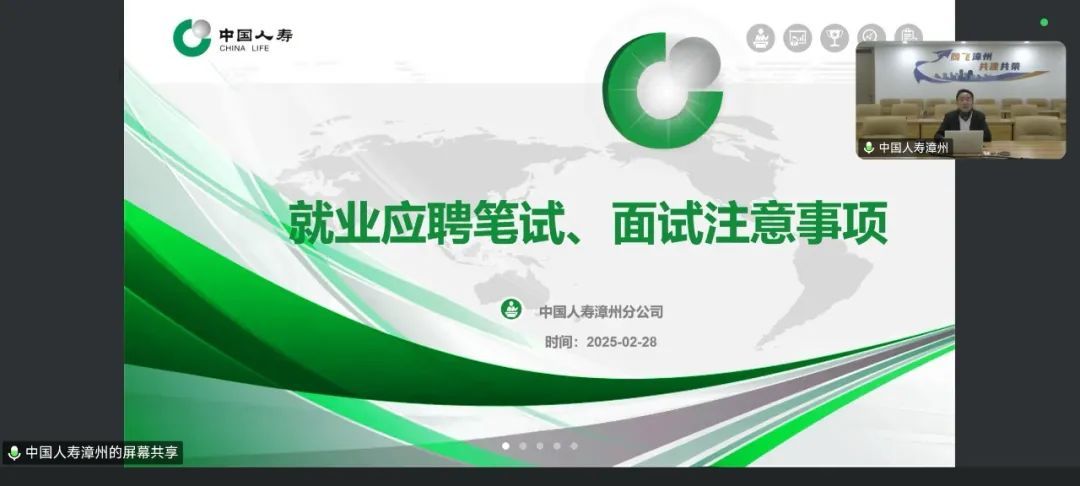 就业季启幕,春招接踵而至,机遇与挑战并存。针对往年“银行、证券、保险”行业就业人员较多的特点,2月28日,公司召开“解锁银行保险岗,共赴职业新航道”线上主题沙龙活动,为正处在求职关键期的2025届毕业生送去“及时雨”。此次活动邀请中国人寿漳州分公司人力资源部经理、中国人寿漳州分公司党委组织部部长柯培辉作为主讲嘉宾,为即将步入职场的毕业生传授宝贵的求职笔试、面试技巧,助力他们提升就业竞争力,在求职道路上精准发力。会议由研究生辅导员李伟俊老师主持,21级辅导员李巍婷老师和2025届毕业生参加本次活动。