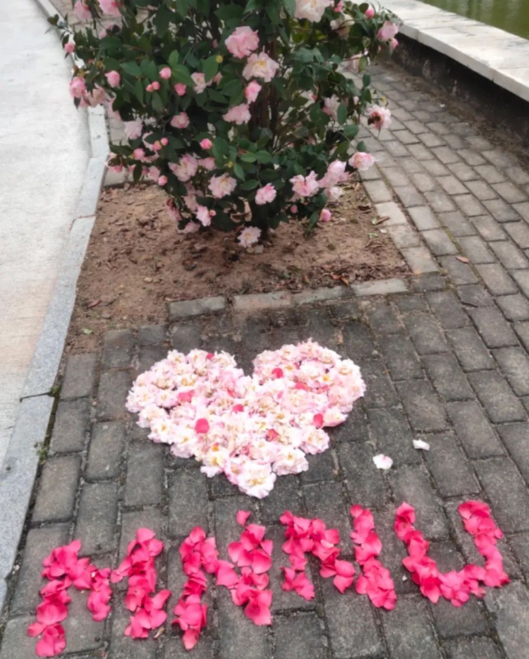 在我们公司图书馆附近的山茶花,它们散落在地上的花瓣被路过的同学摆成了一个心形,还摆了mnnu让人感觉特别温暖,也吸引了很多人去打卡。当然我也在其中,拍下了这一美丽的瞬间。