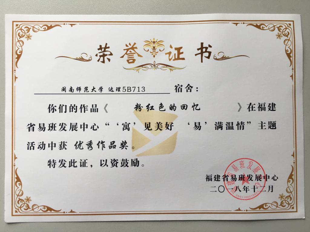 近日,福建省易班发展中心公布“‘寓’见美好,‘易’满温情”主题活动的结果,公司2017级员工(达理5B713宿舍)的作品《粉红色的回忆》在该活动中荣获优秀作品奖。