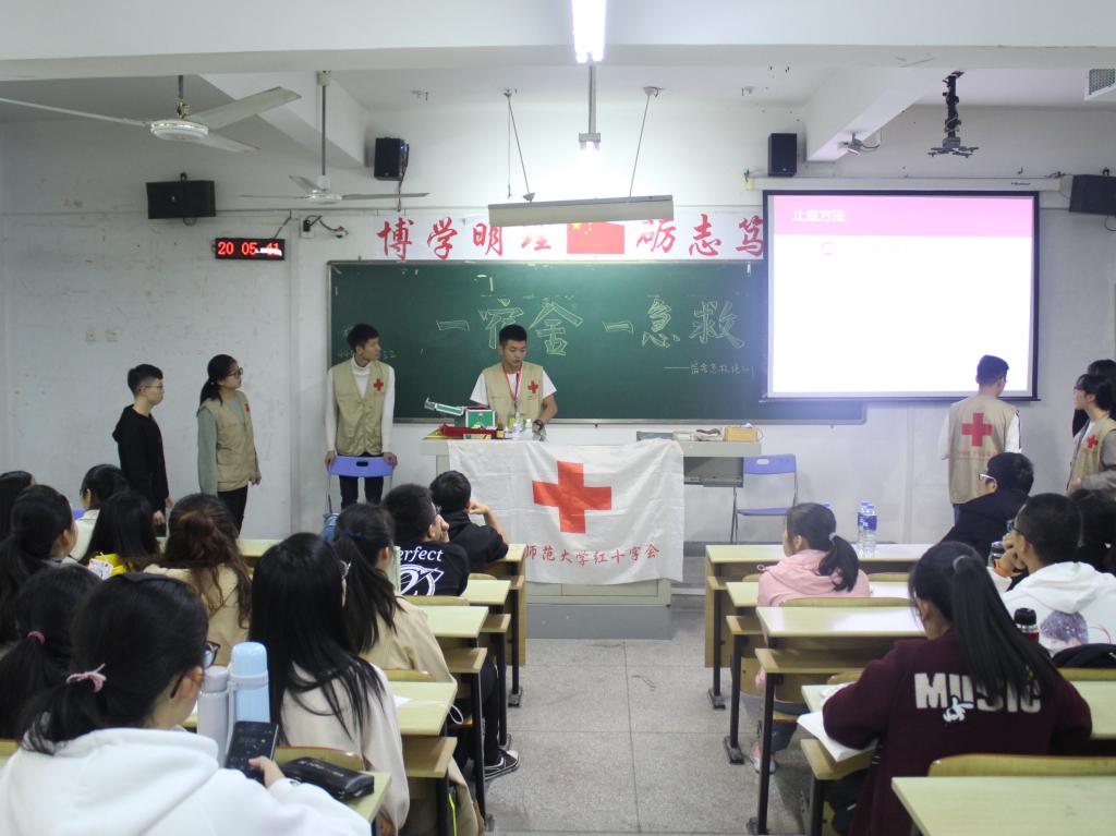 此次培训包含“清创与包扎”和“常见急症讲解”两部分,由校红十字会志愿者讲解相关内容。“清创与包扎”主要讲解了急救箱药品的名称和用途及清创、创伤救护和知识的应用。常见急症知识包括溺水、癫痫、烧烫伤、中暑、晕厥、猝死等要点的基本常识与应急方法。志愿者采取理论与实践相结合,生动直观,易于掌握。在互动与实践环节,志愿者邀请同学分别使用不同的包扎方法。创伤止血包扎处理的现场模拟体验操作,志愿者对操作者的每一个动作逐一进行了规范的指导,取得了较好的培训效果。