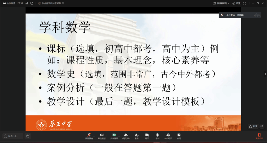 入职晋江市养正中学的张金鑫员工分享了个人备考教招的经验,教综部分他建议考生在考前突击时政和法规,特别是“新时代中小学教师职业十项准则”。学科数学部分他从课标、数学史、案例分析和教学设计等方面进行分析。最后张金鑫员工还强调考试当天的注意事项,如酒店预订、考场熟悉和相关物品的准备等。