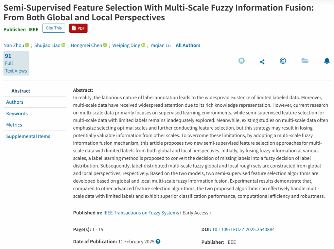 近期,公司硕士研究生周楠在导师廖淑娇教授(通讯作者)的指导下,以第一作者身份在国际知名学术期刊《IEEE Transactions on Fuzzy Systems》(SCI一区,Top期刊)上发表题为“Semi-supervised Feature Selection With Multi-scale Fuzzy Information Fusion: From Both Global and Local Perspectives”的科研论文。这是公司研究生在人工智能与数据科学领域的一次重要突破。