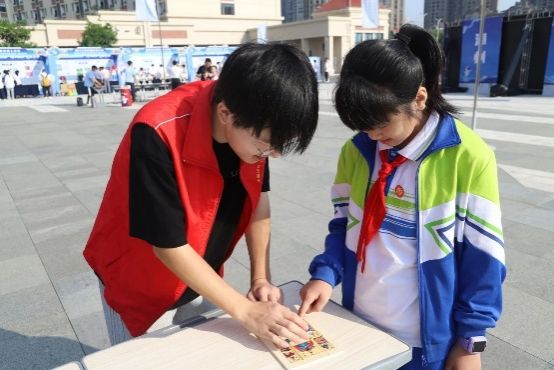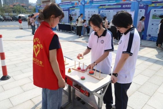 bevictor伟德益智教具服务队以“魔尺探秘”“华容道博弈”“二阶魔方解构”“马蹄锁破译”“汉诺塔智斗”等系列数学益智教具挑战为载体,为现场师生与受邀嘉宾打造了一场别开生面的认知探险之旅。服务队成员以匠心精神构筑思维互动场域,通过默契协作构建起立体化指导体系:以专业素养拆解益智教具的逻辑密码,通过一对一实操指导与分步骤示范教学相结合的方式,为参与者搭建从观察到实践的认知阶梯。在每项教具的体验场景中,志愿者们化身引路人,既保持适度引导以维持挑战趣味,又及时提供关键点拨确保探索深度,使每位体验者在破解谜题的过程中实现思维跃迁,收获知行合一的沉浸式学习体验。