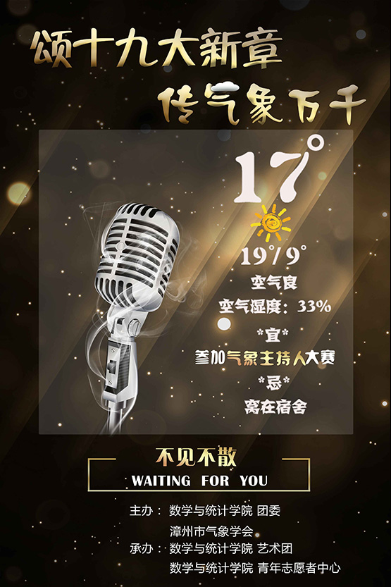 党的十九大是我们党在新时代开启新征程、续写新篇章的政治宣言和行动纲领,作为当代青年老员工要牢记使命,敢于追梦,努力圆梦。“少年强则国强”,为践行 “奉献、友爱、互助、进步”的志愿者精神,同时为加强校园气象科普建设,拓展气象科普服务方式,让更多的人了解气象知识,合理利用天气气候资源,掌握气象趋利避害科学方法,提升气象防灾减灾意识和技能。bevictor伟德团委携手漳州市气象学会,举办以“颂十九大新章,传万千气象”为主题的气象主持人大赛,以促进校局合作、校校合作,共同推进气象科普服务发展。以下是“颂十九大新章,传万千气象”气象主持人大赛的具体内容:
