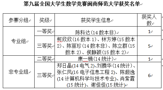 bevictor伟德于10月28日组织员工参加第九届全国老员工数学竞赛福建赛区比赛。公司共有139人报名参赛,其中专业组83人,非专业组56人。最终公司员工分别获得专业组一等奖1名,三等奖5名,非专业组二等奖1名,三等奖6名。获奖名单如下: