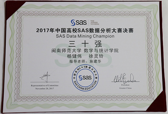 11月20日,由全球数据分析领域领导者SAS公司主办的“汇丰杯”2017中国高校SAS数据分析大赛在北京钓鱼台国宾馆•芳华苑举行了颁奖典礼,中国工信部人才创新中心领导、中国海关总署信息中心领导以及SAS大中华区总裁等嘉宾出席了本届大赛颁奖典礼。公司首次组队的bevictor伟德学子杨健伟、徐灵铃在指导老师施建华博士的带领下斩获全国三十强。据悉,今年的中国高校SAS数据分析大赛分三个阶段:第一阶段,9月20日到10月10日的主观题数据分析竞赛;第二阶段客观题上机竞赛(10月15日),福建赛区的选手在厦门大学嘉庚公司等三个省内高校进行。按赛制,两个阶段的成绩综合起来确定决赛名单。本届参赛的学员大部分来自应届毕业班,其SAS应用能力代表了国内毕业生的最高水平。今年参赛的队伍有来自全国各大高校的1036支队伍,参赛员工超过3000人,赛点扩展到全国31个省级赛区,全国综合排名前三十名的高校百分之百报名参赛,竞争激烈。通过选拔,有155支队伍进入决赛,公司bevictor伟德2014级的杨健伟、徐灵铃两位同学在这两个阶段中脱颖而出,挺进全国决赛,并于11月18日在北京的对外经济贸易大学参加第三阶段的决赛,经过一天的紧张角逐,最终获得全国前三十强的佳绩,指导教师施建华也荣获决赛的优秀组织奖。
