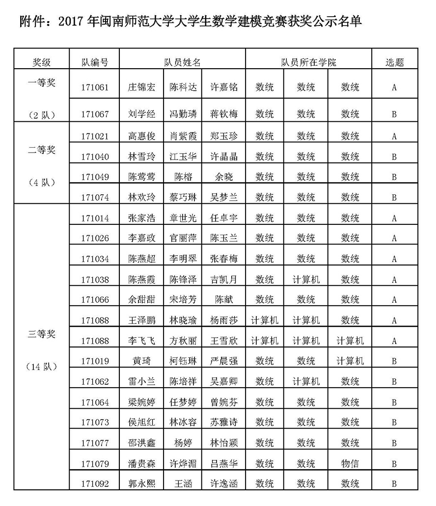 2017年伟德bevictor中文版老员工数学建模竞赛获奖名单公示(征求异议稿)