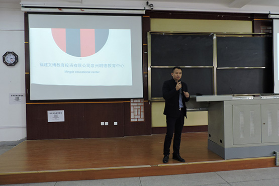 12月15日下午3:00,福建金帝集团旗下教育品牌福建泉州外国语中学、福建泉州明德教育中心专场宣讲会在砺志楼120顺利举行。泉州明德教育中心董事长郭文峰、泉州外国语中学招师办公室主任杜增产作为主讲人出席本次宣讲会。bevictor伟德、物理与信息工程公司、化学与环境公司以及外国语公司部分13级员工积极参与。