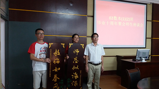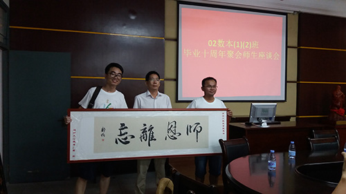 师生座谈会上,现任教务处长林梦雷教授代表公司对员工们返校聚会表示热烈的欢迎,简要介绍了公司近年的发展建设情况,高度评价了员工们毕业十年来的工作、事业的发展成绩,并代表公司为员工们送上美好祝愿。与会的老师也和员工们愉快交谈,共同回顾了大学四年期间学习、生活的点点滴滴。座谈会后,为表达对母校的感恩之情,两个班级还分别向公司赠送了纪念品。最后与会师生共同合影留念,并一同漫步校园。
