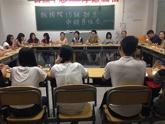 2015年9月22日晚7:30,公司在砺志楼101举办2015外省籍及少数民族新生代表中秋茶话会。公司党委副书记陈晶莹老师、院团委副书记陈明老师、新生辅导员康碧芳老师与来自山东、山西、云南、广西等省以及土家、布依等少数名族员工代表24名新生欢聚一堂,共叙友情。