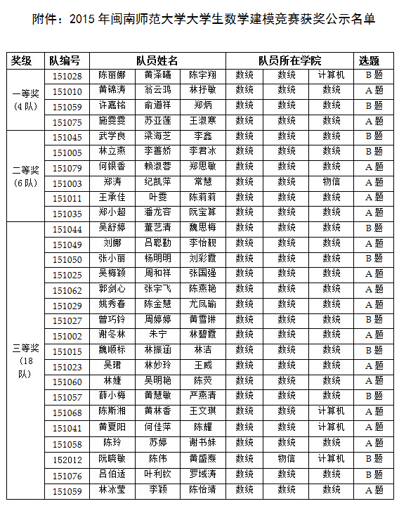 2015年伟德bevictor中文版老员工数学建模竞赛获奖名单公示(征求异议稿)