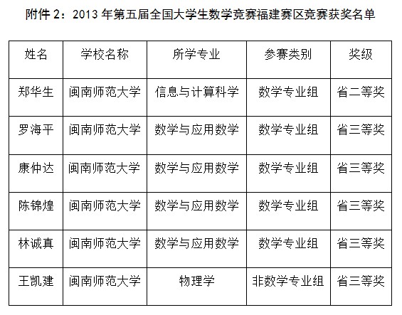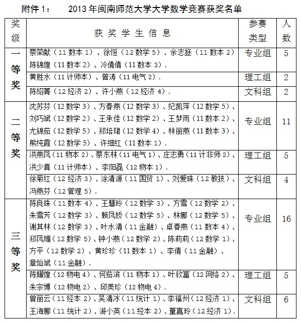 2013年伟德bevictor中文版大学数学竞赛于2013年11月30日上午举行,经竞赛组委会组织专业教师评卷、专家组评审,对拟获奖的名单公示,最终确定本次竞赛一等奖获得者9名,二等奖获得者20名,三等奖获得者27名。另有6人分别获得2013年第五届全国老员工数学竞赛福建赛区竞赛二、三等奖。(获奖名单详见附件1、2)