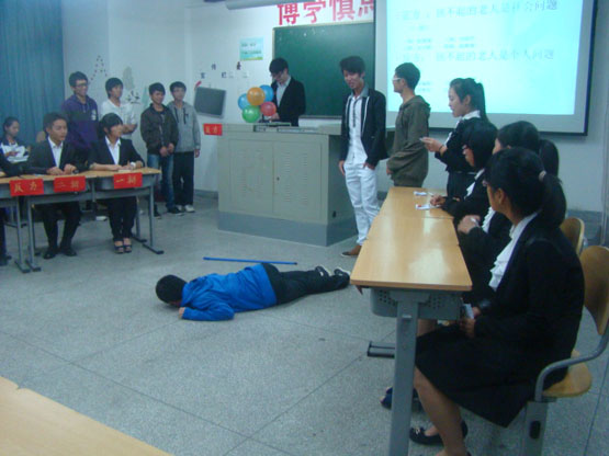 本次新生辩论比赛分为两场:第一场是个人赛决赛,第二场是班级赛决赛。个人赛的辩题是“裸婚是利大于弊还是弊大于利”,班级赛的辩题是“扶不起的老人是社会问题还是个人问题”。两个辩题都是同学们比较关注的社会热点,比赛过程中,同学们通过对两个问题的辩论,不时碰撞出许多思想的火花。例如关于裸婚,正方认为裸婚将婚姻自由体现得最充分,婚姻不应该过多地受到物质的制约和影响。而反方认为裸婚弊大于利:“没房子就没有户口,那孩子怎么办?”辩论场上,同学们还通过表演的形式批判社会的不健康现象。关于扶老人的问题,12数学3班的辩手请同学表演老人跌倒时的世间百态。当那个扮演老人的同学很敬业的啪一声摔在地上时,观众一阵惊呼。而后其他同学扮演路人路过却无人去扶,好不容易有人去扶还叫人拍照,以免被人讹诈,演的十分形象。