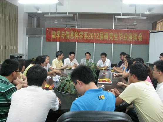 2012年6月14日下午, 我系在砺志楼114举行了2012届研究生毕业座谈会.我系党总支书记徐志怀教授, 主任李克典教授, 副主任蔡建平教授, 员工辅导员梁红梅老师和教学秘书林伟华老师出席了本次座谈会, 我系2012届毕业班研究生参加此次座谈会. 座谈会由副主任蔡建平教授主持.