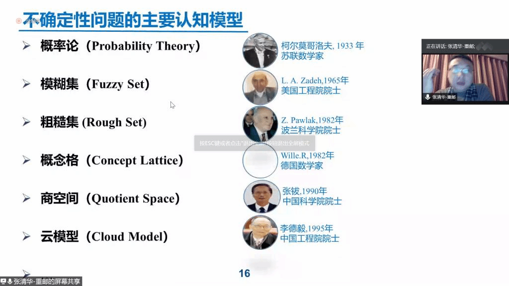 应公司邀请,12月26日上午,重庆邮电大学张清华教授在腾讯会议上作了题为《不确定性问题的多粒度认知分析思维》的报告。相关师生聆听了此次报告,报告由廖淑娇副教授主持。