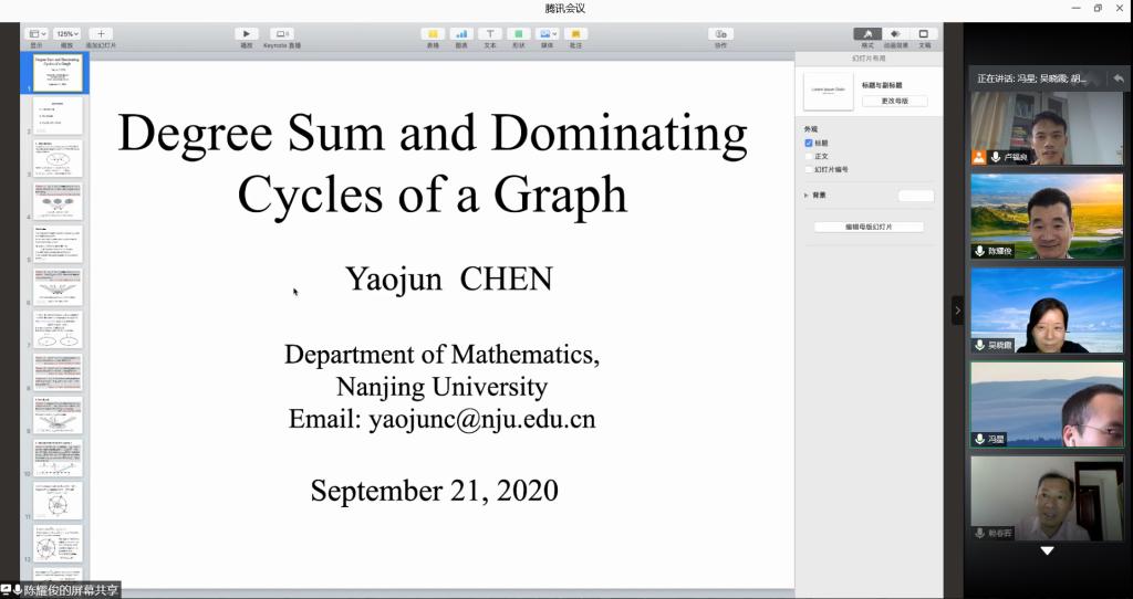 应公司邀请,9月21日下午,南京大学陈耀俊教授在腾讯会议作了题为《DegreeSum andDominatingCyclesof a Graph》的报告。相关师生聆听了此次报告,报告由卢福良教授主持。