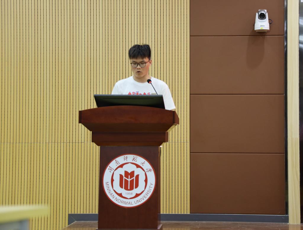 第六届全国师范院校师范生教学技能大赛一等奖获得者陈辉煜同学在分享获奖感言中,对校领导的关心支持、公司提供的良好设施、指导老师的悉心教导,竞赛队友的互帮互助表示衷心的感谢,并分享了竞赛过程中的心路历程。他表示,在庆祝中国共产党建党100周年之际,希望与各位同学一起,不忘初心、牢记使命,用不懈的努力、顽强的拼搏,去达到希望的高峰。