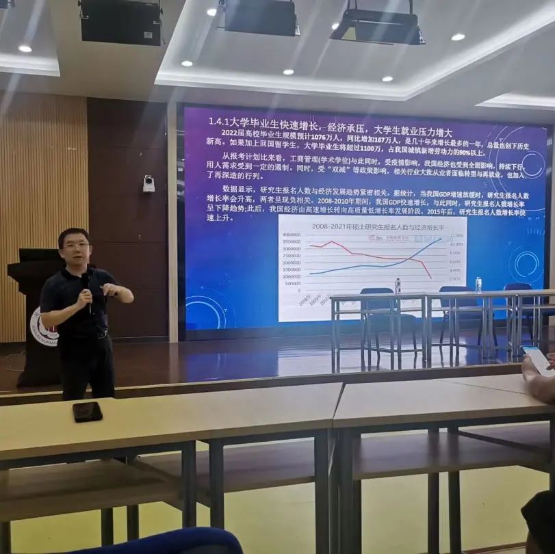 沙龙伊始,首先,胡副书记对今年毕业生就业形势进行通报,并就升学及二战考研的利弊进行分析,接着从宏观上对近年来的考研形势进行研判,指出研究生报名人数持续增加,报考专业硕士研究生的人数已逐渐超过学术型硕士。其次,胡副书记就考研院校选择、考研复习规划等方面进行指导。最后,胡副书记总结了公司2022届毕业生考研情况,提醒同学们要认真借鉴学长学姐们的宝贵经验,走好考研路。