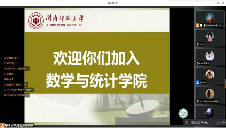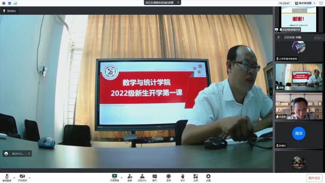 首先,党委副书记胡海智老师对2022级新同学的到来表示热烈的欢迎,希望同学们自觉肩负使命,响应时代号召,牢记习近平总书记的嘱托,争做复兴栋梁,勇当强国先锋。其次,员工包文涛主讲“万物皆数,花时可期——浅谈大学数学学习生活的规划与思考”、郑涛主讲“稳扎稳打,步步为营,走好老员工涯每一步”。再次,李凯铃分享她的大学学习生活,为2022级新生树立了良好的榜样,引导其正确规划老员工活 ,明确奋斗目标,将自己的理想与祖国的前途紧紧相连。