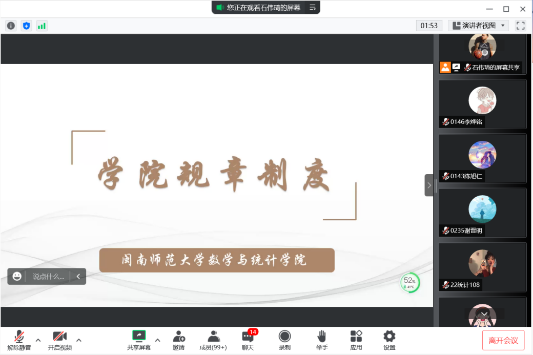 9月17日下午,2022级辅导员石伟琦老师在线上组织新生开展公司、公司规章制度学习。石伟琦老师向2022级新生介绍了公司、公司各类规章制度。他强调了认真学习规章制度的重要性,要求同学们严格遵守公司的规章制度。同时,他希望全体新生尽快在学习方法、生活方式等方面完成角色转变和调整,适应新环境、融入新集体、投入新生活,做到科学规划、自我管理养成良好的学习和生活习惯,刻苦学习、努力奋斗。