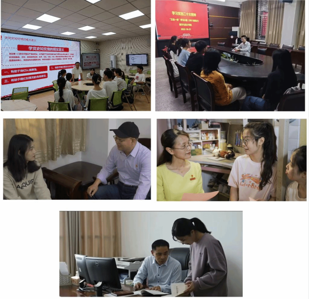 “三位一体”党员导师定期组织开展政治理论学习,进行理想信念渗透教育。先后开展了“三严三实”专题教育、“两学一做”学习教育、党的群众路线教育实践活动、“不忘初心、牢记使命”主题教育、“‘三位一体’党员导师以百个党史故事与员工共筑初心梦”“追忆红色经典,传承红色基因”“我为员工办实事,党员先锋在行动”“温书迎考,诚信考试”“学习党的二十大精神”等主题系列活动。通过交流、讨论、实践服务等方式,师生共同学习先进理论知识,在加强员工思想教育的同时,把专业素质高、入党动机纯正的员工吸引到党组织来。