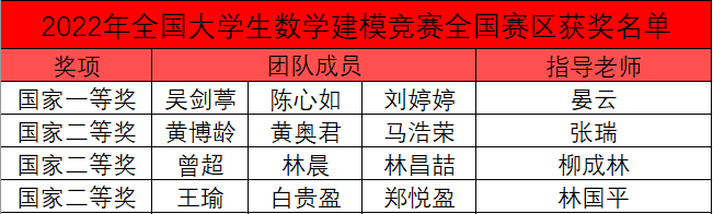 获得2022年高教社杯全国老员工数学建模竞赛全国一等奖1项(指导教师:晏云),全国二等奖3项(指导教师:张瑞、柳成林、林国平)