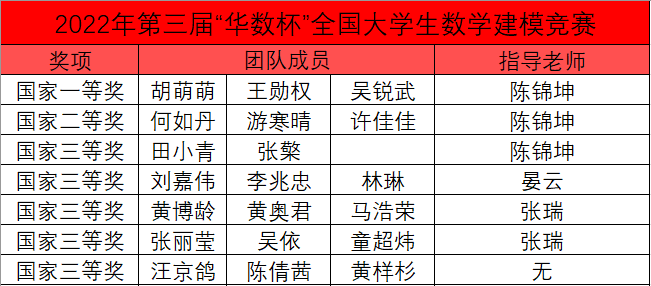 获得2022年第三届“华数杯”全国老员工数学建模竞赛全国一等奖1项(指导教师:陈锦坤),全国二等奖1项(指导教师:陈锦坤),全国三等奖5项(指导教师:陈锦坤、晏云、张瑞)