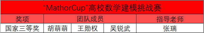 获得“MathorCup”高校数学建模挑战赛全国三等奖1项(指导教师:张瑞)