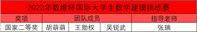 获得2022年数维杯国际老员工数学建模挑战赛全国二等奖1项(指导教师:张瑞)