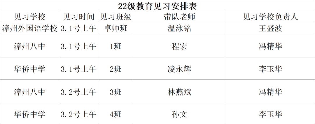 3月1日至3月2日,公司22级全体师范生分班走进漳州外国语公司、华侨中学和漳州八中,进行了为期两天的见习活动。在公司带队老师以及相应中学的对接老师的引导下,见习活动有序开展。