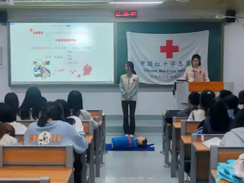 比赛前期,校红十字会急救队成员为参赛选手进行了急救技能的培训,培训心肺复苏、止血、包扎等基本知识和要领,教学过程中理论与实践相结合,用模型进行现场示范教学。
