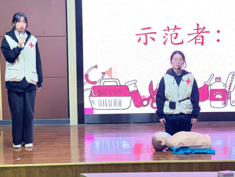 校红十字会急救队队员向大家展示了心肺复苏的部分流程。