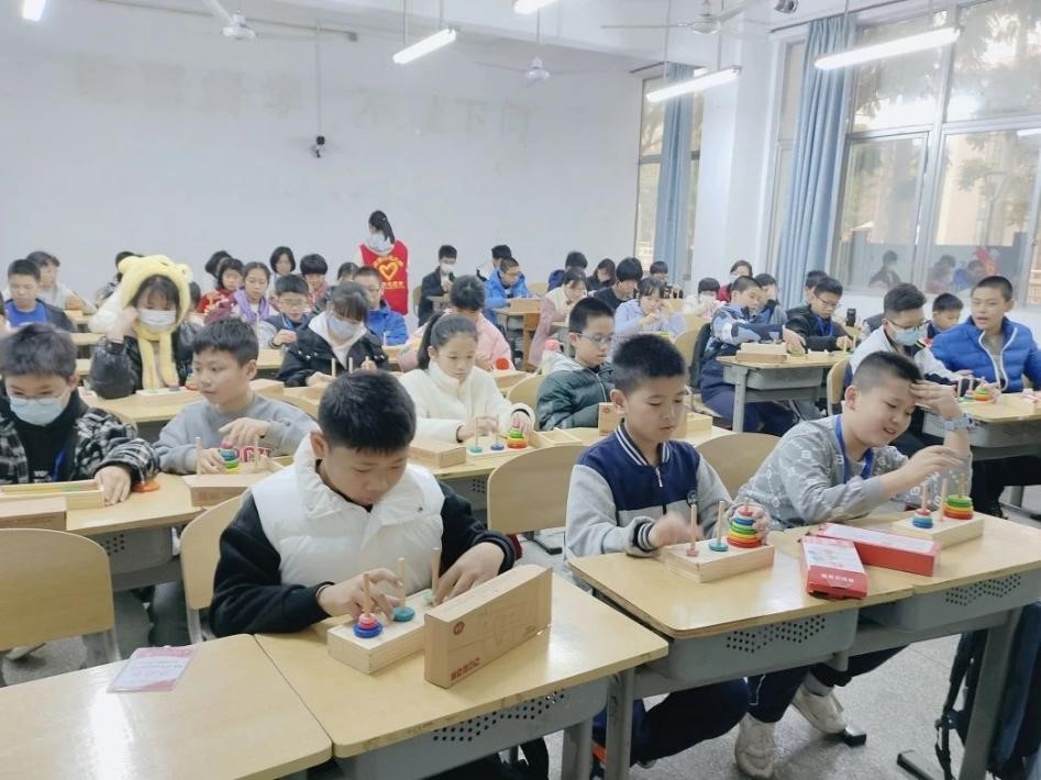 在益智教具活动环节,志愿服务队员们主要介绍了“华容道”、“九连坏”和“汉诺塔”这三种益智教具。随着三位志愿者的讲解,学员们在过程中积极互动,不断探索,在乐趣中学习数学。