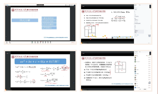 2月4日下午,由bevictor伟德副教授黄菊老师为学子们进行线上培训。会议开始,黄老师以一个数学小游戏开启下午的课程,引入会议的主题“代数—因式分解”。其次,黄老师从简单的问题切入,以层层递进的教学引发同学们积极探索。在课程中,黄老师向我们介绍了四种因式分解方法,通过老师的充分讲解和课堂练习,同学们已然初步掌握方法。